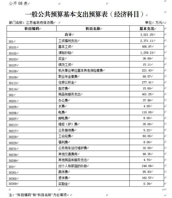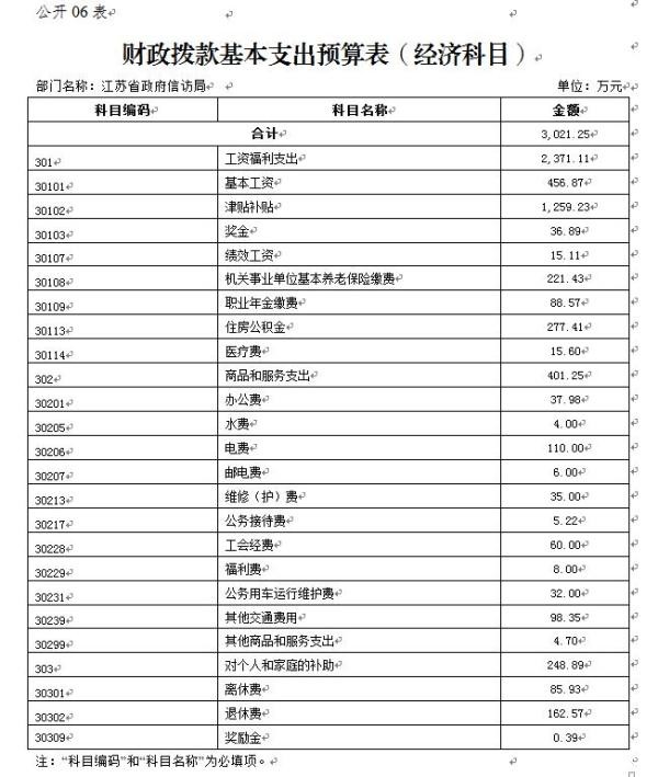 江苏省政府信访局2019年度一般公共预算财政拨款基本支出预算3021.25万元,其中:
