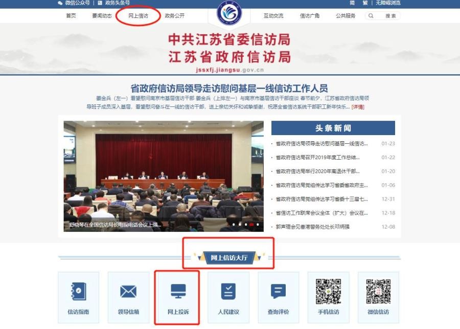 (1)登陆江苏省政府信访局网站(),选择“网上信访大厅”中的领导信箱和网上投诉。