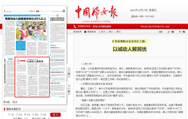 最近,王颖火了。身为江苏省溧阳市信访局党组书记、局长的她成了中央组织部、中央宣传部公布的全国32名“最美公务员”之一,也是江苏唯一获此殊荣的人。12月7日,中国妇女报全媒体记者来到江苏省溧阳市信访局,亲身感受到她的忙碌状态和“最美”姿态。