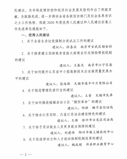 关于2020年度优秀人民建议