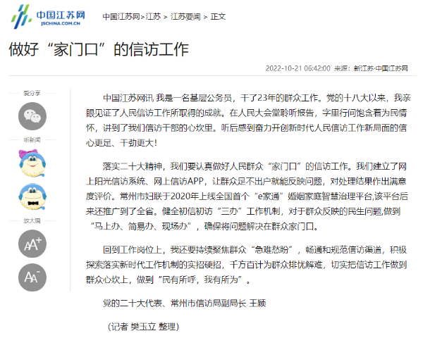 落实二十大精神,我们要认真做好人民群众“家门口”的信访工作。我们建立了网上阳光信访系统、网上信访APP,让群众足不出户就能反映问题,对处理结果作出满意度评价。常州市妇联于2020年上线全国首个“e家通”婚姻家庭智慧治理平台,该平台后来还推广到了全省。健全初信初访“三办”工作机制,对于群众反映的民生问题,做到“马上办、简易办、现场办”,确保将问题解决在群众家门口。
