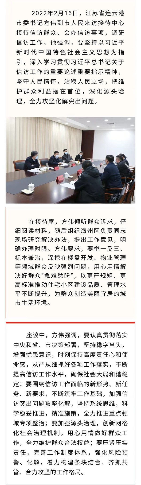 连云港市委书记方伟接待信访群众会办信访事项调研信访工作