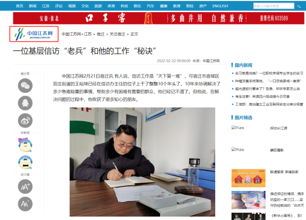 中国江苏网2月21日宿迁讯 有人说,信访工作是“天下第一难”,可宿迁市宿城区双庄街道的王裕坤已经在信访办主任的位子上干了整整10个年头了。10年来协调解决了多少急难险重的事情,帮助多少有困难有需要的群众,他已经记不清了。但他说,在解决问题的过程中,他收获了很多知心的朋友。