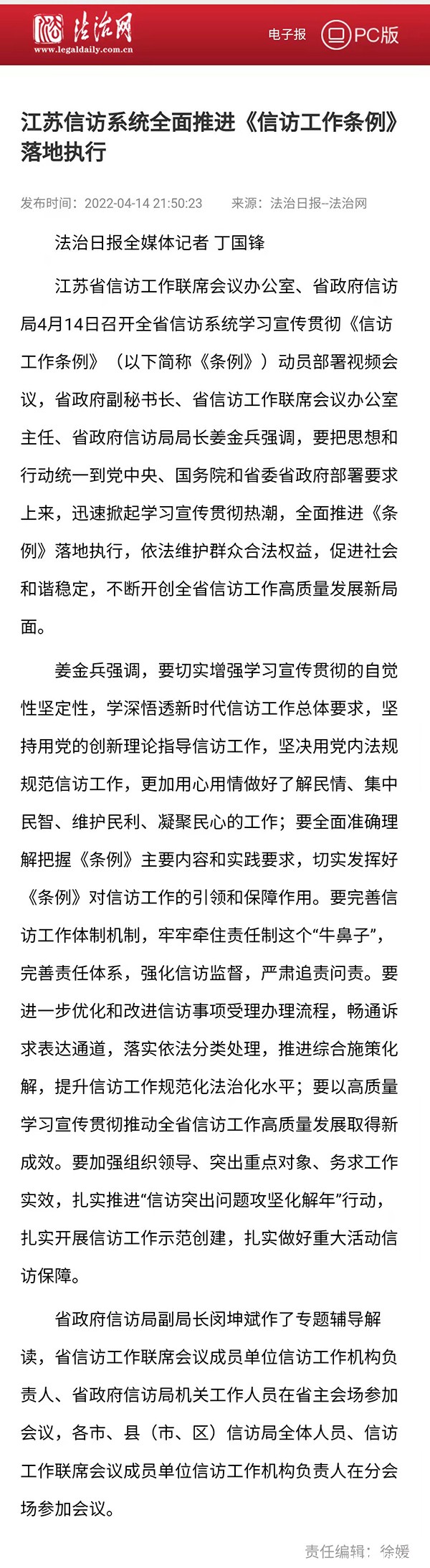 江苏省信访工作联席会议办公室、省政府信访局4月14日召开全省信访系统学习宣传贯彻《雷竞技reybat官网》(以下简称《条例》)动员部署视频会议,省政府副秘书长、省信访工作联席会议办公室主任、省政府信访局局长姜金兵强调,要把思想和行动统一到党中央、国务院和省委省政府部署要求上来,迅速掀起学习宣传贯彻热潮,全面推进《条例》落地执行,依法维护群众合法权益,促进社会和谐稳定,不断开创全省信访工作高质量发展新局面。
