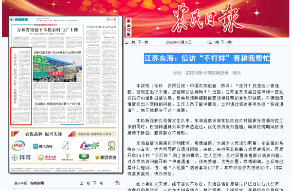 “您好!我想给小麦施肥,但现在出行不便,您能帮助协调吗?”日前,江苏省东海县白塔埠镇一吉姓农民打电话到县信访局,反映其想跨镇到自家规模经营的麦地里施肥,车辆因疫情管控出入受阻的问题。工作人员了解详情后,立即通过信访事项办理“快速通道”,当天就解决了这个难题。