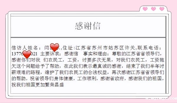 近日,闫某向“省长信箱”致信,对有关部门及时协调解决他反映的工资拖欠信访问题,切实维护农民工合法权益,表达真诚谢意。