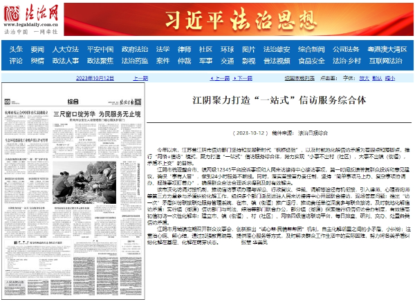 今年以来,江苏省江阴市信访部门坚持和发展新时代“枫桥经验”,以及时就地化解信访矛盾为着眼点和落脚点,推行“网格+信访”模式,聚力打造“一站式”信访服务综合体,努力实现“小事不出村(社区),大事不出镇(街道),矛盾不上交”的目标。