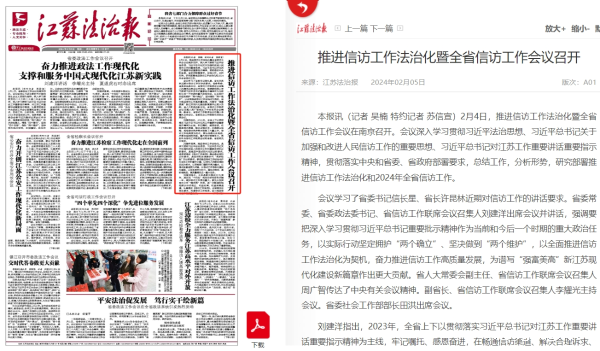 本报讯(记者 吴楠 特约记者 苏信宣)2月4日,推进信访工作法治化暨全省信访工作会议在南京召开。会议深入学习贯彻习近平法治思想、习近平总书记关于加强和改进人民信访工作的重要思想、习近平总书记对江苏工作重要讲话重要指示精神,贯彻落实中央和省委、省政府部署要求,总结工作,分析形势,研究部署推进信访工作法治化和2024年全省信访工作。